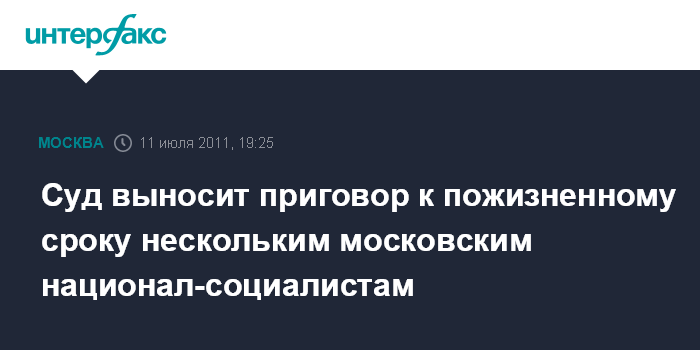 Москва. 11 июля. INTERFAX.RU - Московский окружной военный суд (МОВС) приговаривает к пожизненному заключению нескольких членов национал-социалистического общества за убийство и попытку организовать теракт.