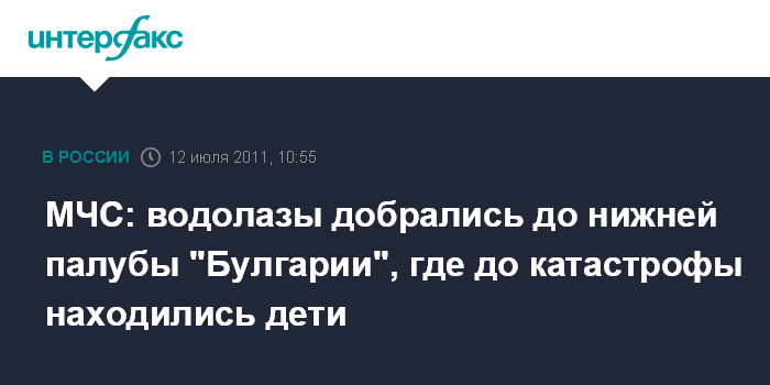 Москва. 12 июля. INTERFAX.RU - Водолазы, обследующие затонувший в Куйбышевском водохранилище теплоход "Булгария", добрались до нижней палубы, где находилась детская комната.