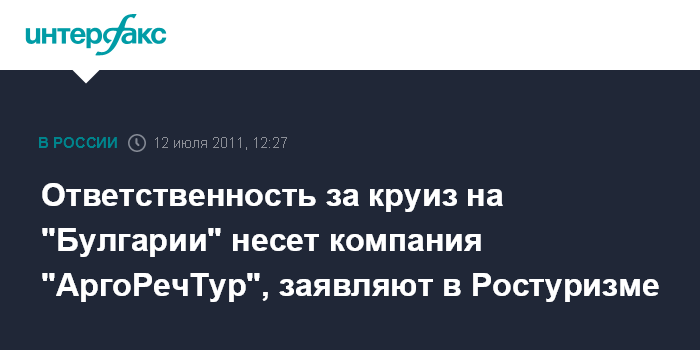 Москва. 12 июля. INTERFAX.RU - Компания "АргоРечТур" не входит в Реестр туроператоров России, соответственно, она предлагала круизные туры на "Булгарии", не имея на это права, сообщил агентству заместитель главы Ростуризма Евгений Писаревский.