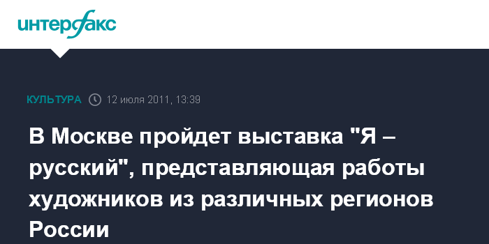 Москва. 12 июля. INTERFAX.RU – Двадцатого июля в галерее "А3" откроется выставка "Я – русский", которая объединит работы художников-выходцев из различных республик РФ: Магомеда Кажлаева из Дагестана, Константина Инал-Ипа из Абхазии, Николая Шиняева из Калмыкии, Лусинэ Джанян, которая считается одной из самых талантливых художниц Юга России. Организаторы выставки указывают, что задачей мероприятия является преодоление внутренних барьеров в осознании русской культуры как переплетения различных культурных традиций, смешения стилей, техник и концепций.