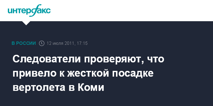 Москва. 12 июля. INTERFAX.RU - Следственные органы по республике Коми приступили к проверке обстоятельств жесткой посадки вертолета МИ-8, в результате которого пострадала женщина, сообщили в следственном комитете РФ.