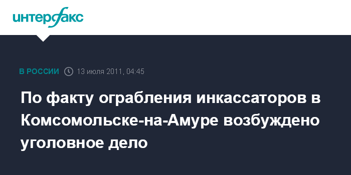 Хабаровск. 13 июля. ИНТЕРФАКС - ДАЛЬНИЙ ВОСТОК - В Хабаровском крае по факту нападения на инкассаторов в Комсомольске-на-Амуре и хищению около 4,5 млн рублей возбуждено уголовное дело, сообщил агентству "Интерфакс - Дальний Восток" в среду врио начальника пресс-службы УМВД по Хабаровскому краю Максим Пестерев.