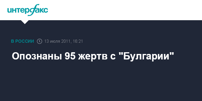Нижний Новгород. 13 июля. INTERFAX.RU - В Республиканском бюро судебно-медицинской экспертизы Татарстана опознали 95 погибших в результате крушения теплохода "Булгария", сообщается на сайте Минздрава республики.