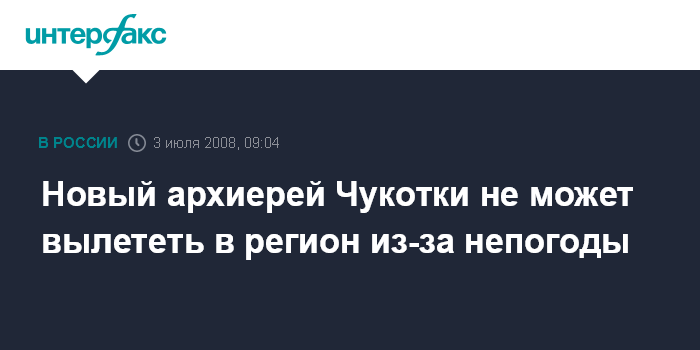 Москва. 3 мюля. INTERFAX.RU - Вылет архиепископа Хабаровского и Приамурского Марка на Чукотку, где он должен принять дела у епископа Диомида, пока задерживается из-за погодных условий.