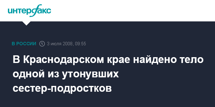 Москва. 3 июля. INTERFAX.RU – В Усть-Лабинском районе Краснодарского края спасатели разыскали тело утонувшей 13-летней девочки, которая пропала во время купания в реке Лаба с 12-летней сестрой 28 июня.