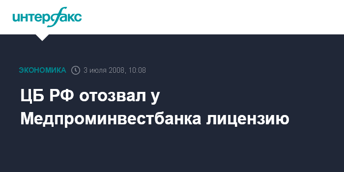 Москва. 3 июля. INTERFAX.RU – Банк России приказом от 2 июля отозвал у Международного промышленного инвестиционного банка (Медпроминвестбанк, Москва) лицензию на осуществление банковских операций, говорится в сообщении департамента внешних и общественных связей Банка России.