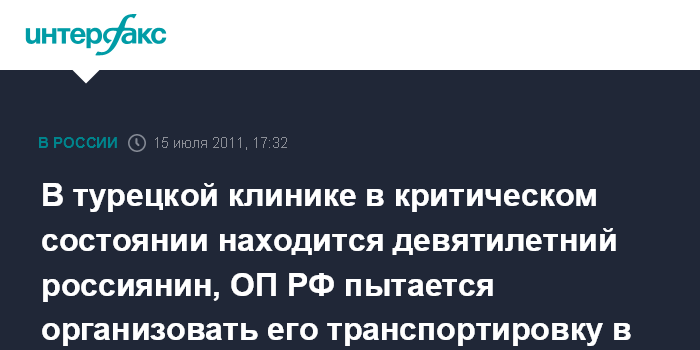 Москва. 15 июля. INTERFAX.RU - Общественная палата РФ обратилась в Минздравсоцразвития России за помощью в транспортировке из Турции девятилетнего Кирилла Гудкова, находящегося в критическом состоянии после тяжелой травмы, полученной на курорте Алания.