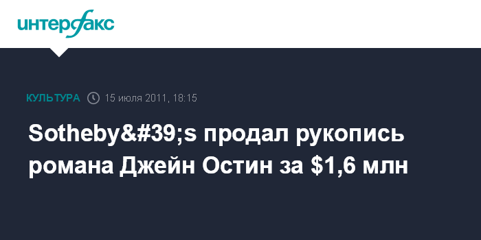 Лондон. 15 июля. INTERFAX.RU - Редкая рукопись романа английской писательницы Джейн Остин была продана на аукционе Sotheby's в Лондоне за 993,25 тыс. фунтов стерлингов ($1,6 млн). Данная цена втрое превысило ожидаемую выручку за произведение, сообщила BBC.