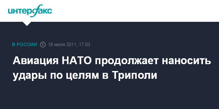 Брюссель. 18 июля. INTERFAX.RU - Авиация НАТО продолжила в понедельник наносить удары по целям в Триполи, сообщила журналистам представитель пресс-службы НАТО Кармен Ромеро.