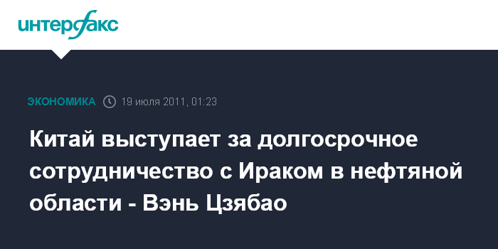 "Китай поощряет участие китайских компаний в установлении устойчивых долгосрочных связей с Ираком в области нефти и газа, расширении разведки, добычи переработки, взаимовыгодном сотрудничестве в сфере торговли оборудованием", - сказал глава китайского правительства на переговорах с премьер-министром Ирака Нури аль-Малики.