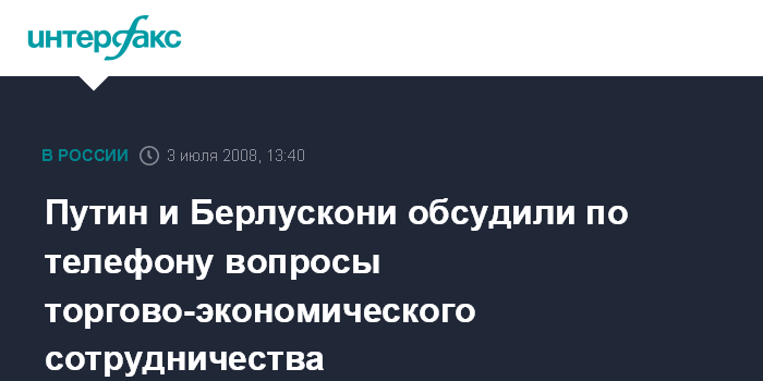 Москва. 3 июля. INTERFAX.RU – Председатель правительства РФ Владимир Путин в четверг провел телефонный разговор с премьером Италии Сильвио Берлускони.