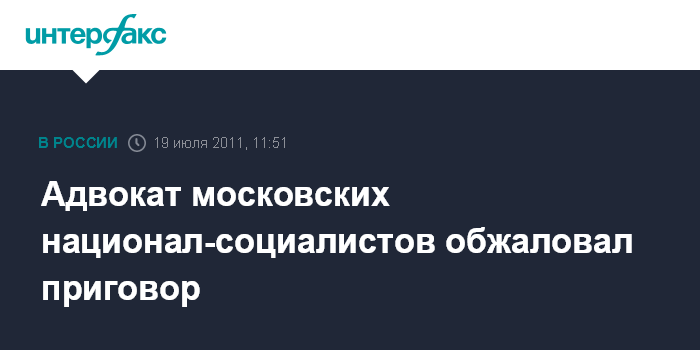 Москва. 19 июля. INTERFAX.RU - Обжалован приговор членам национал-социалистического общества, получившим про приговору суда в Москве значительные сроки вплоть до пожизненного заключения за убийства, покушения и попытку организовать теракт. "Я отправил по почте кассационную жалобу", - сказал "Интерфаксу" адвокат одного из фигурантов Сергей Сташевский. По его словам, для клиента он просит смягчения приговора.