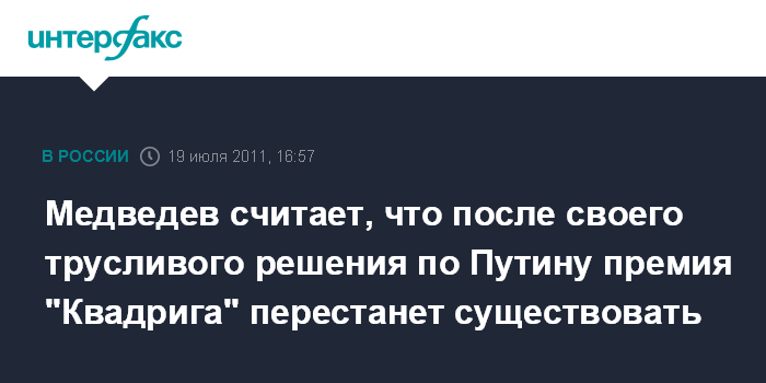 Медведев считает, что после своего трусливого решения по Путину премия "Квадрига" перестанет существовать