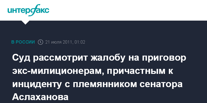 Москва. 21 июля. ИНТЕРФАКС - Мосгорсуд рассмотрит жалобу на приговор четырем экс-сотрудникам ОВД "Митино", которые получили реальные сроки за превышение полномочий при задержании участников драки и конфликте с племянником члена Совета Федерации Асламбека Аслаханова, оперативником МУРа Мансуром Аслахановым.