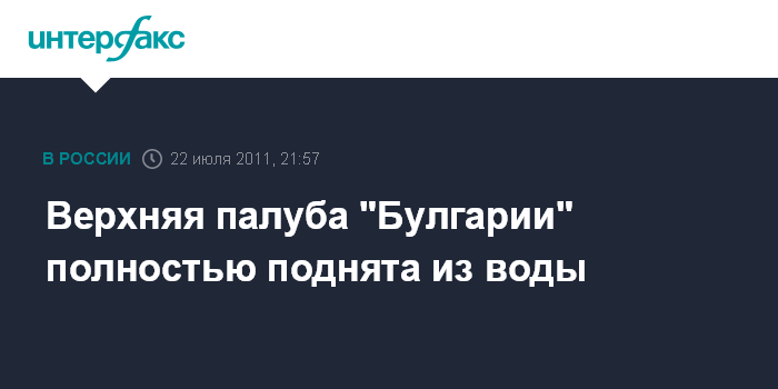 Куйбышевский затон. 22 июля. INTERFAX.RU - Специалистам к 21:45 мск удалось полностью поднять из воды верхнюю палубу теплохода "Булгарии", сообщил "Интерфаксу" в пятницу официальный представитель оперативного штаба по подъему теплохода Тимур Хикматов.