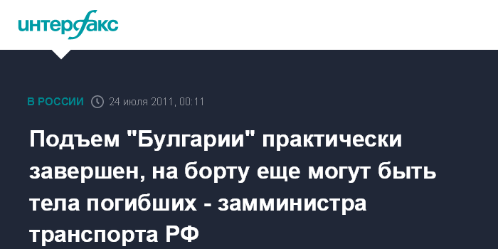 Куйбышевский затон. 24 июля. ИНТЕРФАКС-ПОВОЛЖЬЕ – Операция по подъему теплохода "Булгария" практически закончилась, сообщил в субботу журналистам замминистра транспорта РФ Виктор Олерский, который находится непосредственно в районе крушения теплохода.
