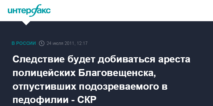 Москва. 24 июля. INTERFAX.RU - Следственный комитет России будет ходатайствовать об аресте благовещенских полицейских, отпустивших подозреваемого в педофилии, сообщил "Интерфаксу" в воскресенье официальный представитель СК РФ Владимир Маркин. "Несмотря на действия местной прокуратуры, следователи будут ходатайствовать об аресте сотрудников управления внутренних дел, отпустивших подозреваемого в педофилии", - подчеркнул В.Маркин.