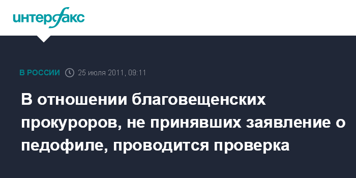 Москва. 25 июля. INTERFAX.RU - Следственный комитет России начал доследственную проверку в отношении двух работников прокуратуры Амурской области, которые отказались принимать заявление от матери семилетней девочки, пострадавшей от педофила, заявил "Интерфаксу" официальный представитель СК РФ Владимир Маркин.