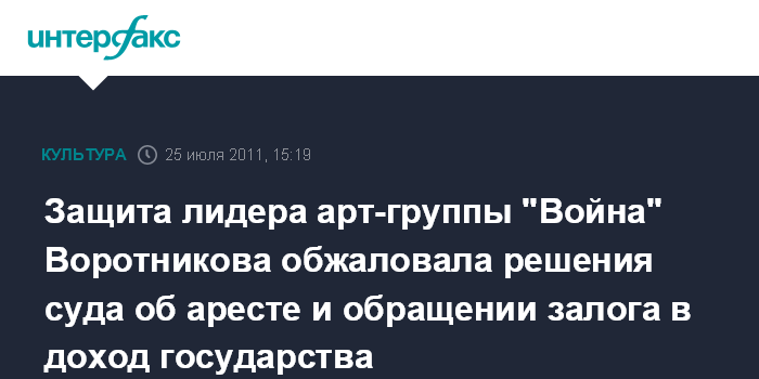 Санкт-Петербург. 25 июля. INTERFAX.RU - Защитники лидера арт-группы "Война" Олега Воротникова обжаловали судебные решения об обращении залога в доход государства, а также о заочном аресте своего клиента, сообщила "Интерфаксу" в понедельник его адвокат Анастасия Екимовская. "Мы обжаловали оба судебных решения - и об обращении залога в доход государства, и о заочном аресте", - сказал Екимовская.