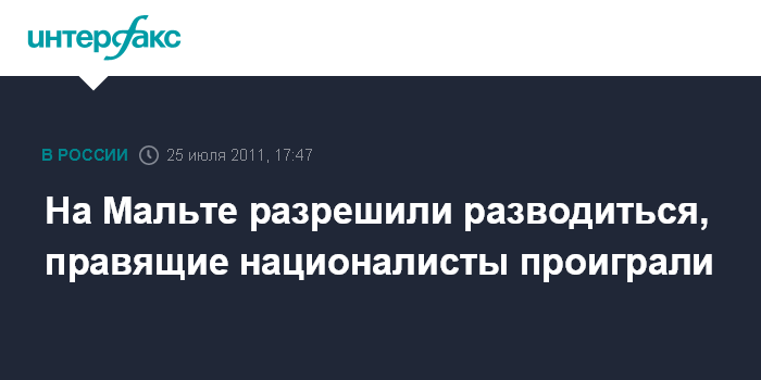 Лондон. 25 июля. INTERFAX.RU - Законопроект о легализации разводов принят в Республике Мальте, сообщает в понедельник британская газета The Guardian.