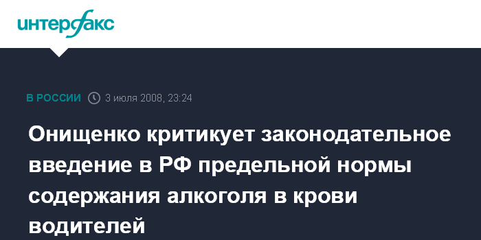 Москва. 3 июля. ИНТЕРФАКС - Главный государственный санитарный врач России, академик РАН Геннадий Онищенко считает вредной вступившую в силу 1 июля норму, устанавливающую предельное количество содержания алкоголя в крови водителя.