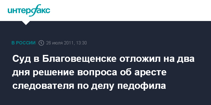 Благовещенск. 26 июля. INTERFAX.RU - Заседание суда в Благовещенске (Амурская область) по рассмотрению ходатайства СКР об аресте следователя Юрия Кукаева, рекомендовавшего полицейским отпустить подозреваемого в педофилии, перенесено во вторник на четверг, 28 июля. "Заседание по нашему следователю продолжится в четверг", - сообщил агентству "Интерфакс - Дальний Восток" во вторник помощник руководителя СУ СКР по Амурской области Алексей Лубинский.