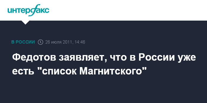 "Для нас принципиально важно, чтобы все действительно виновные попали в "список Магнитского" на российской границе, а не на американской. Мы делаем все для того, чтобы люди из этого списка в конечном итоге не могли выехать не только в Америку, но и вообще не могли покинуть территорию страны, и предстали перед судом", - заявил М.Федотов.