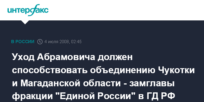Уход Абрамовича должен способствовать объединению Чукотки и Магаданской области - замглавы фракции "Единой России" в ГД РФ Пехтин