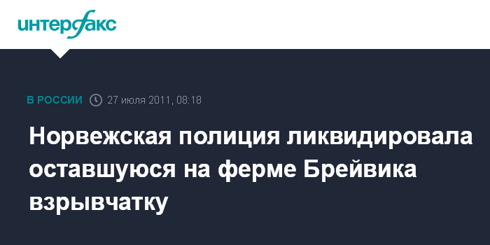 Лондон. 27 июля. INTERFAX.RU - В ночь на среду полиция Норвегии уничтожила взрывоопасные вещества, найденные на ферме подозреваемого в двойном теракте Андерса Брейвика, сообщает британская телерадиокорпорация BBC.