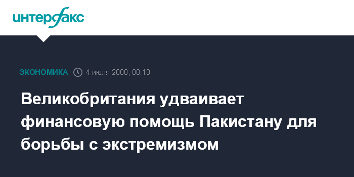 Москва. 4 июля. INTERFAX.RU - Великобритания удваивает помощь Пакистану до 450 фунтов млн стерлингов ввиду обеспокоенности относительно активности пакистанских радикальных исламских группировок, которые препятствуют борьбе с боевиками движения "Талибан" в соседнем Афганистане.