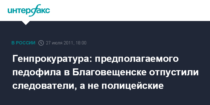 Москва. 27 июля. INTERFAX>RU - Решение об освобождении предполагаемого педофила в Благовещенске было принято сотрудником Следственного комитета России, а не полицейскими, заявляют в Генпрокуратуре.