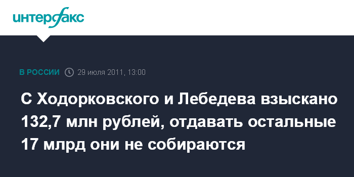 Москва. 29 июля. INTERFAX.RU - Судебные приставы взыскали с бывшего главы НК "ЮКОС" Михаила Ходорковского и экс-руководителя МФО "Менатеп" Платона Лебедева по первому приговору более 132 млн рублей из 17 млрд наложенного взыскания.