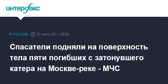 Москва. 31 июля. ИНТЕРФАКС - Спасателям МЧС РФ удалось поднять на поверхность тела пяти погибших при крушении прогулочного катера на Москва реке, заявил журналистам замначальника ГУ МЧС РФ по Москве Юрий Беседин.