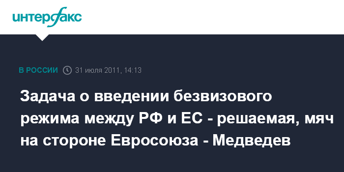 Задача о введении безвизового режима между РФ и ЕС - решаемая, мяч на стороне Евросоюза - Медведев