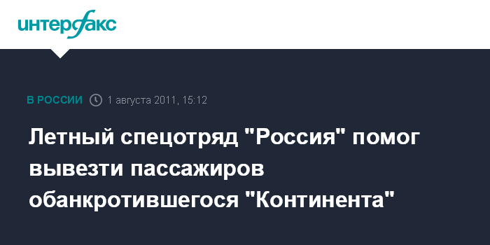 Москва. 1 августа. INTERFAX.RU - Специальный летный отряд "Россия", который занимается перевозкой первых лиц государства, помог перевезти пассажиров обанкротившейся авиакомпании "Континент", сообщил "Интерфаксу" пресс-секретарь управделами президента РФ Виктор Хреков.