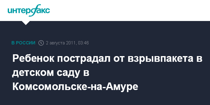 Хабаровск. 2 августа. ИНТЕРФАКС-ДАЛЬНИЙ ВОСТОК - В Комсомольске-на-Амуре (Хабаровский край) в одном из детских садов в руках ребенка взорвался взрывпакет, сообщили агентству "Интерфакс-Дальний Восток" в пресс-службе УМВД по Хабаровскому краю во вторник.