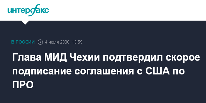 Москва. 4 июля. INTERFAX.RU - Чехия в конце июля подпишет с США соглашение о размещении у себя элементов американской системы противоракетной обороны, заявил глава чешского МИД Карел Шварценберг на брифинге в Баку. "Это (размещение элементов системы ПРО - ИФ) - важный для Европы вопрос. В некоторых странах есть ракеты с большим радиусом действия. В настоящее время проблема ПРО может казаться не такой значимой, но в будущем, когда многие страны будут обладать такими ракетами, это будет представлять большую угрозу миру. Поэтому Чехия приняла решение участвовать в ПРО", - отметил министр.