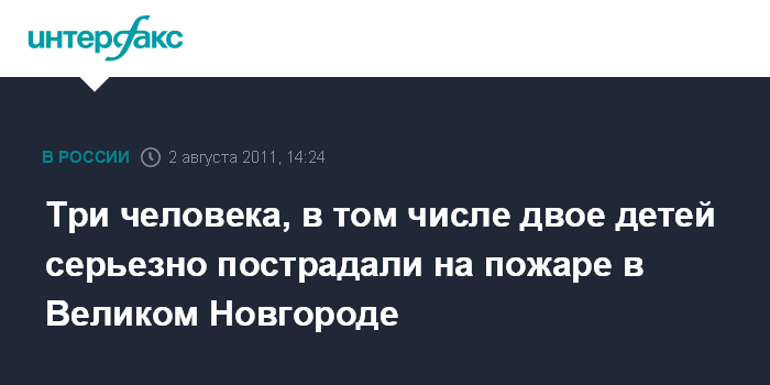Великий Новгород. 2 августа. INTERFAX.RU - При пожаре в жилом доме в Великом Новгороде пострадали три человека, в том числе двое детей, сообщили "Интерфаксу" в областном управлении МЧС.