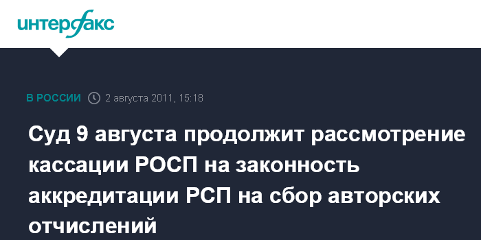 Суд 9 августа продолжит рассмотрение кассации РОСП на законность аккредитации РСП на сбор авторских отчислений