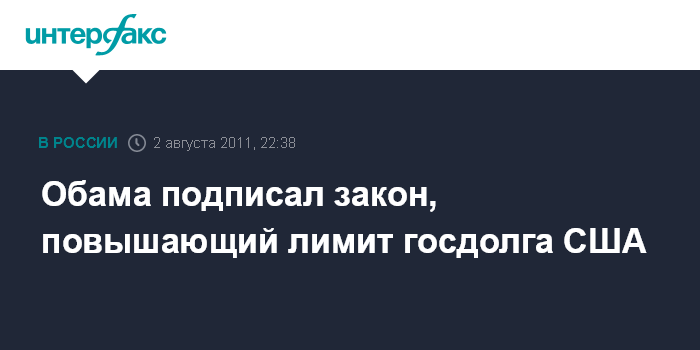 Вашингтон. 2 августа. ИНТЕРФАКС - Президент США Барак Обама поставил подпись под принятым конгрессом законом о госдолге, сообщил Белый дом.