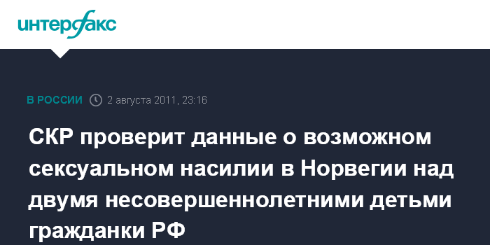 Москва. 2 августа. ИНТЕРФАКС - Председатель СКР Александр Бастрыкин поручил организовать проверку сведений, распространенных в ряде СМИ, о возможно имевшем место быть сексуальном насилии над несовершеннолетними детьми гражданки РФ Ирины Баргсет, проживающей в Норвегии.