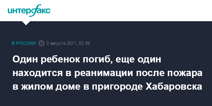 Хабаровск. 3 августа. ИНТЕРФАКС-ДАЛЬНИЙ ВОСТОК - В селе Ракитное Хабаровского района во время пожара в пятиэтажном жилом доме, произошедшем во вторник, пострадали женщина и двое детей, один ребенок скончался.