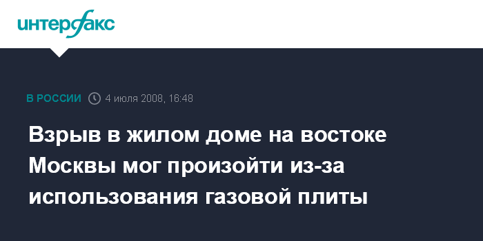 Москва. 4 июля. INTERFAX.RU - Неправильное подключение газовой плиты могло стать причиной взрыва в минувший четверг в квартире жилого дома на востоке Москвы. Специалисты Мосгаза, прибывшие на место ЧП по адресу Первомайская улица, дом 115, установили, что "газовая плита в квартире была подключена к сети с помощью гибкой подводки кустарным способом", - сообщил "Интерфаксу" источник в комплексе городского хозяйства в пятницу.