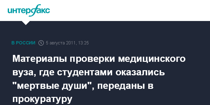 Москва. 5 августа. INTERFAX.RU - Рособрнадзор передал в прокуратуру материалы проверки в Российском государственном медицинском университете имени Пирогова, где были выявлены нарушения, связанные с приемом в студенты "мертвых душ", сообщила "Интерфаксу" в пятницу глава Рособрнадзора Любовь Глебова.