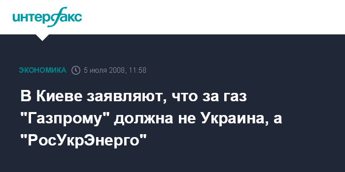 Москва. 5 июля. NTERFAX.RU - За газ российскому "Газпрому" должна не Украина, а компания "РосУкрЭнерго", заявил председатель правления НАК "Нафтогаз Украины" Олег Дубина в интервью еженедельнику "Зеркало недели", опубликованном в субботу.