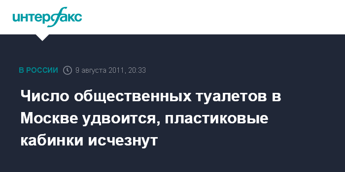 Москва. 9 августа. INTERFAX.RU - Количество общественных туалетов на московских улицах власти города намерены увеличить в два раза, сообщил мэр столицы Сергей Собянин в эфире программы "События" телеканала ТВЦ. "Количество туалетов предполагается увеличить в два раза", - сказал он, комментируя прошедшее во вторник заседание правительства Москвы.