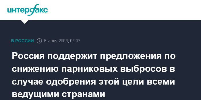 Москва. 6 июля. ИНТЕРФАКС - Позиция России заключается в поддержке долгосрочной цели по снижению выбросов парниковых газов, но при условии одобрения этой цели всеми ведущими странами, заявил журналистам высокопоставленный источник в российской делегации, которая примет участие в саммите G8 ("большой восьмерки") на японском острове Хоккайдо 7-9 июля.