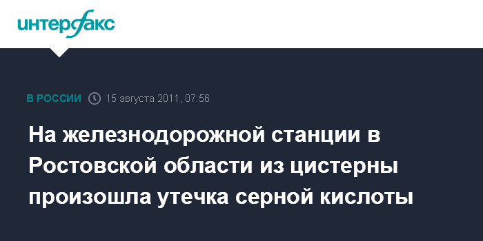 Ростов-на-Дону. 15 августа. INTERFAX.RU - Утечка серной кислоты из цистерны произошла на железнодорожной станции Батайск в Ростовской области, сообщили агентству "Интерфакс-Юг" в пресс-службе Южного регионального центра МЧС России.