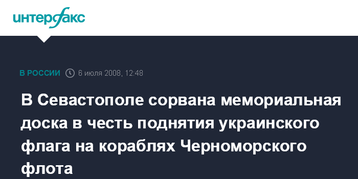 Москва. 6 июля. INTERFAX.RU - В Севастополе представители пророссийских организаций, а также несколько депутатов городского совета, в субботу в полдень сорвали мемориальную доску, установленную на Графской пристани в связи с 90-летием поднятия украинского флага на кораблях Черноморского флота.