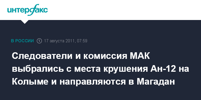 Владивосток. 17 августа. ИНТЕРФАКС - ДАЛЬНИЙ ВОСТОК - Группа специалистов комиссии МАК и оперативники следственных органов, работавшие на Колыме на месте катастрофы Ан-12, возвращаются в Магадан.